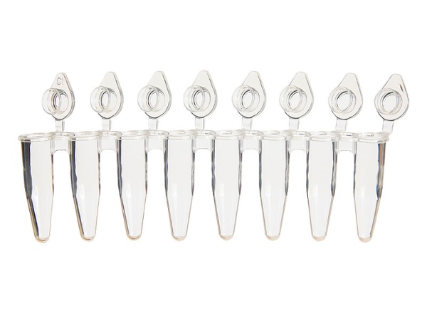 Nắp phẳng trong suốt, thân trong suốt, dải 8 tube liền nắp, thể tích 200ul.